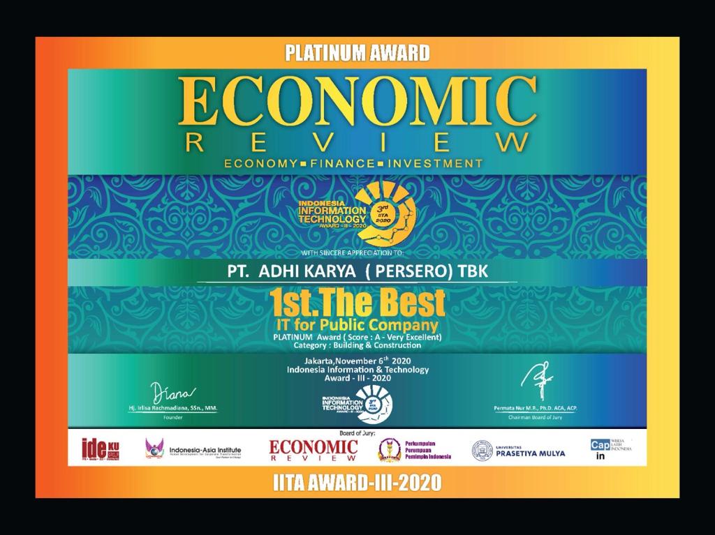 “Kami berharap penghargaan ini akan terus kami pertahankan dan kalau bisa akan kami tingkatkan, terima kasih pula kepada Economic Review beserta seluruh jajaran dewan juri atas kepercayaannya memberikan penghargaan ini kepada kami, ini adalah apresiasi atas kerja keras dan kerja cerdas seluruh jajaran Adhi Karya,” ujar Inonu Ferryanto mewakili PT Adhi Karya (Persero) Tbk.