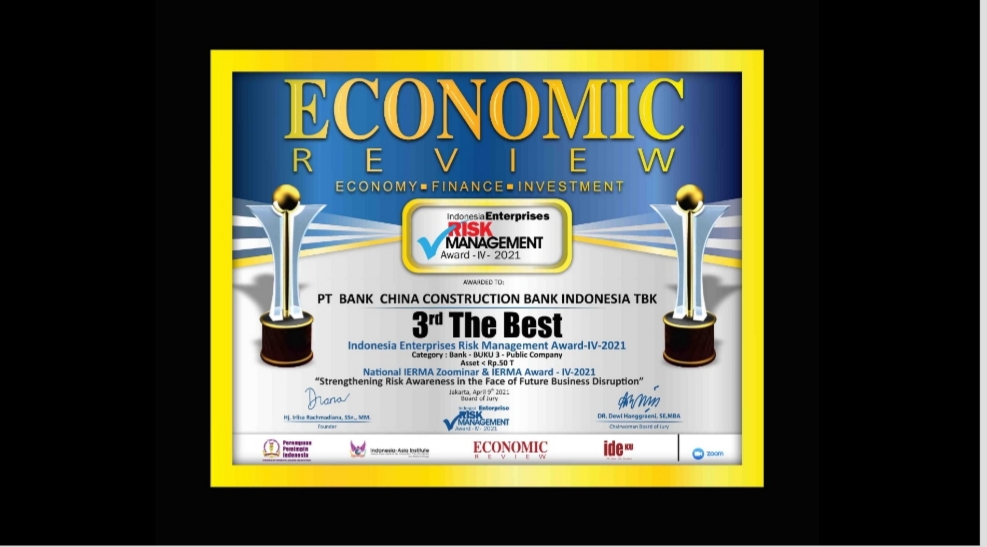 Pada acara bergengsi tersebut, PT Bank China Constructiin Bank Indonesia Tbk. dinobatkan sebagai 3rd- The Best Indonesia Enterprises RiskManagement– 2021 – Category : Bank – BUKU 3 – Public Company – Asset< Rp.50 T oleh Economic Review.
