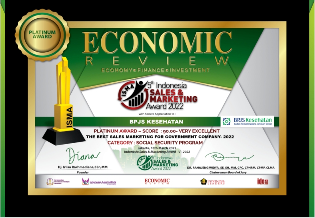 EconomicReview – BPJS Kesehatan kembali meraih prestasi di tahun 2022 pada ajang Indonesia Sales Marketing Award (ISMA-V-2022) yang digelar oleh Economic Review secara online.