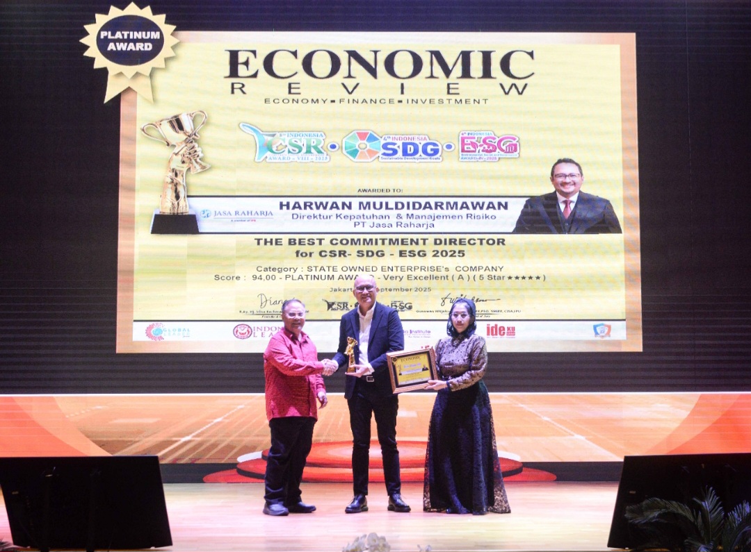 Harwan Muldidarmawan selaku Direktur Kepatuhan dan Manajemen Risiko PT Jasa Raharja meraih The Best Commitment Director For CSR–SDG–ESG 2025, Category : Stated Owned Enterprises Company – Platinum Award.