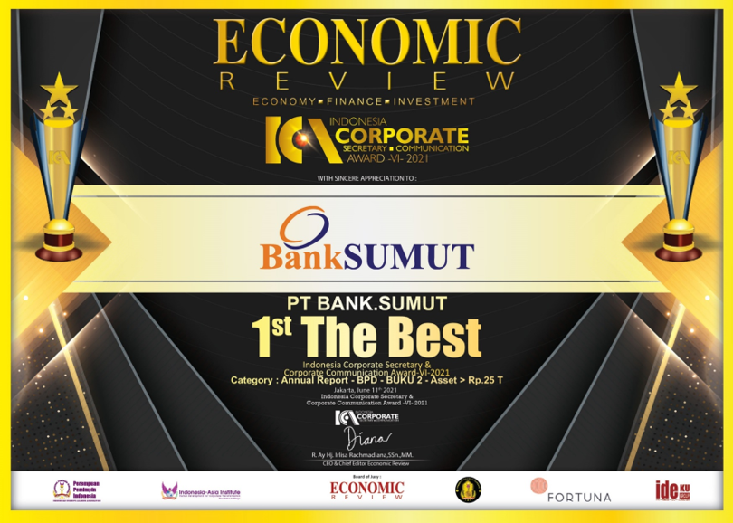 EconomicReview – Divisi Corporate Secretary dan Corporate Communication PT Bank Sumut diakui terbaik. Hal ini dibuktikan dengan perolehnya penghargaan 1st The Best Indonesia Corporate Secretary & Corporate Communication Award VI 2021 untuk kategory Annual Report BPD BUKU II dengan aset lebih dari Rp25 triliun.