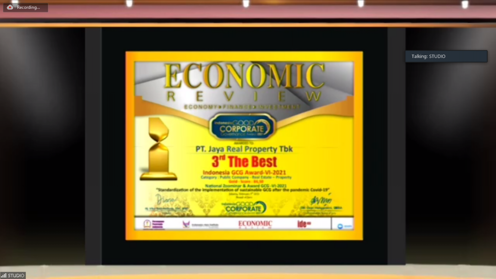 EconomicReview-PT. Jaya Real Property Tbk memenangkan penghargaan dalam ajang Indonesia Good Corporate Governance Award-VI-2021 (IGCGA-VI-2021) dengan meraih predikat 3rd. The Best-Indonesia GCG Award –VI – 2021, Category : Public Company – Real Estate – Property. Jaya Real Property dinilai mampu membangun bisnisnya di atas prinsip-prinsip tata kelola perusahaan yang baik dan berkomitmen penuh untuk mempertahankan standar tertinggi praktik tata kelola perusahaan.