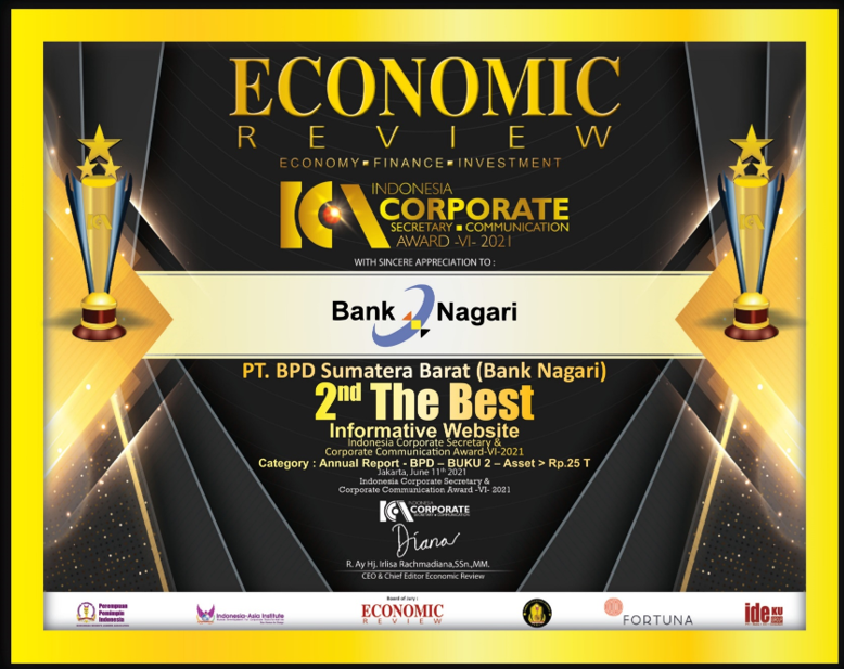 EconomicReview – PT BPD Sumatera Barat (Bank Nagari) berhasil menyabet penghargaan 2nd The Best Informative Website 2021 Indonesia Corporate Secretary & Corporate Communication Award -VI-2021 untuk kategori BPD BUKU II dengan asset lebih dari Rp 25 triliun.
