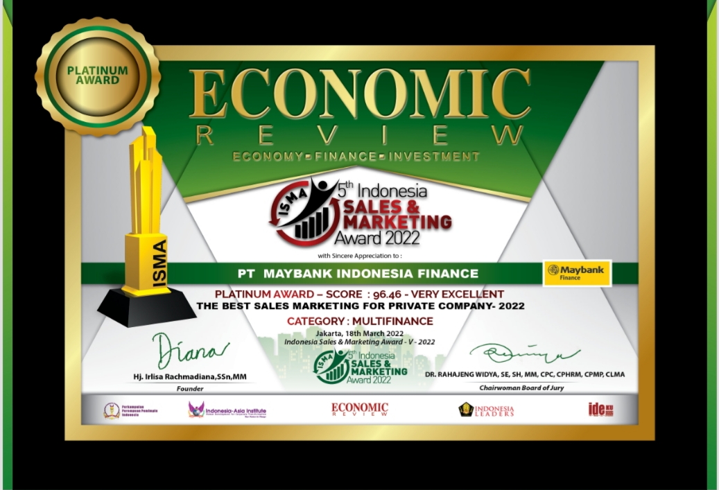 EconomicReview – PT Maybank Indonesia Finance berhasil meraih penghargaan bergengsi di awal tahun 2022 pada ajang Indonesia Sales Marketing Award 2022 (ISMA-V-2022) yang sukses digelar oleh Economic Review secara online.