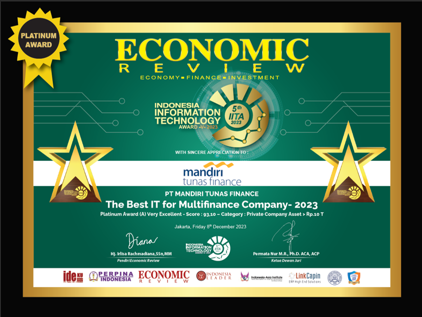 “Saya ucapkan puji syukur kepada Tuhan Yang Maha Esa, MTF meraih penghargaan Indonesia IT Award 2023. Hal ini tentu sebagai bentuk apresiasi yang luar biasa bagi kami dan kedepannya semoga kami dapat terus memberikan kontribusi yang terbaik khususnya bidang Teknologi Informasi. Saya ucapkan terima kasih kepada Dewan Juri, Economic Review sebagai Media Penyelenggara Penghargaan ini atas apresiasi yang telah diberikan kepada Mandiri Tunas Finance serta kepada seluruh stakeholder dan shareholder yang selalu memberikan dukungan dan kepercayaan kepada MTF,” ujar Kanda Octaviano.