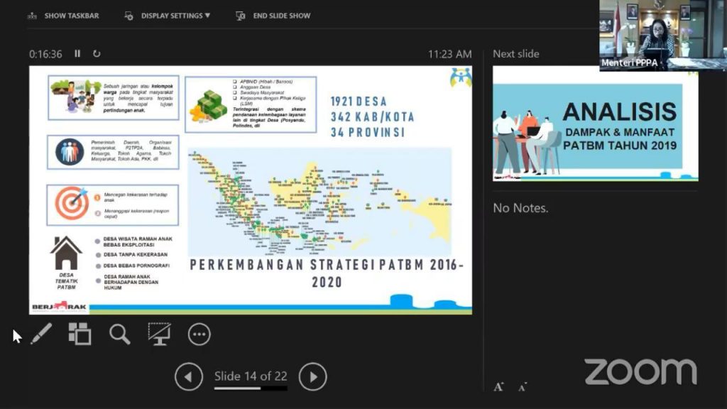 “Untuk melindungi anak dari kekerasan termasuk di masa pandemi Covid-19 sekarang ini, memerlukan keterlibatan masyarakat secara masif. Kemen PPPA berupaya memaksimalkan peran masyarakat melalui gerakan PATBM sebagai salah satu gerakan masyarakat dalam upaya deteksi dini terhadap ancaman atau kasus pelanggaran pemenuhan hak dan perlindungan anak, termasuk ancaman akibat wabah Covid-19,” ujar Menteri Bintang dalam paparannya.