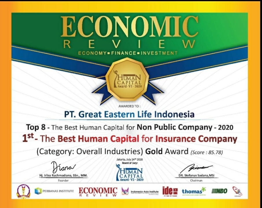 EconomicReview-PT Great Eastern Life Indonesia berhasil membawa pulang dua penghargaan Indonesia Human Capital Award VI-2020 dipertengahan tahun yakni dengan meraih 1st. The Best Human Capital for Insurance Company, (category: Overall Industries) Gold Award (Score : 85.78) dan Top 8 -The Best Human Capital for Non Public Company – 2020.