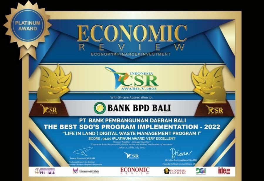 Pada ajang tersebut Bank BPD Bali berhasil meraih The Best SDG’s Program Implementation 2022, Life In Land Digital Waste Management Program – Platinum Award dengan Score 91,00 dan The Best President Director Of Companies In Indonesia For CSR 2022 yang ditujukan untuk I Nyoman Sudharma, SH, MH. Penerimaan penghargaan ini diwakili oleh Kepala Divisi Umum dan Kesekretariatan BPD Bali IB Gd. Ary Wijaya Guntur, S.E., M.M., secara online.