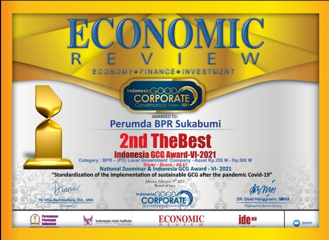 Dinilai telah menerapkan prinsip Good Corporate Governance (GCG) secara konsisten dan sangat baik sehingga mampu memacu perusahaan untuk terus bertumbuh dan berkembang serta meningkatkan prestasi dan kinerjanya, BPR Sukabumi menerima penghargaan 2nd The Best – Indonesia GCG Award –VI-2021 untuk kategori BPR – (PD) Local Government Company beraset Rp250 miliar – Rp500 miliar.