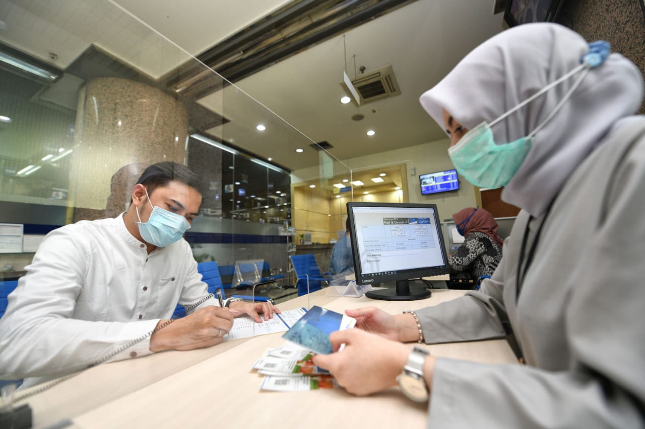 Nasabah Unit Usaha Syariah (UUS) PT Bank Tabungan Negara (Persero) Tbk. tengah melakukan transaksi di kantor BTN Syariah di Jakarta, Rabu (7/4).